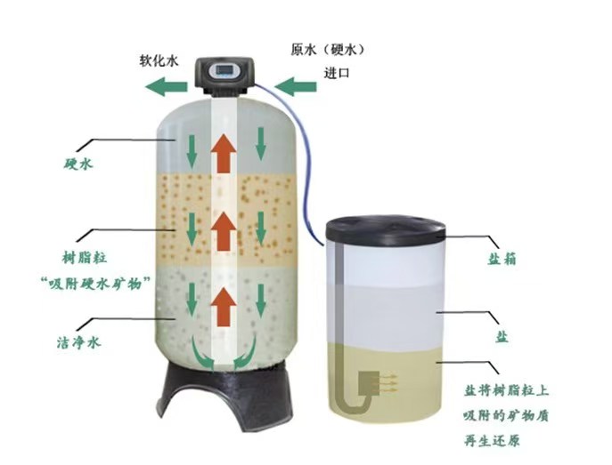 - 1.供水:未处理的水通过树脂层,发生交换反应,产生软水。
